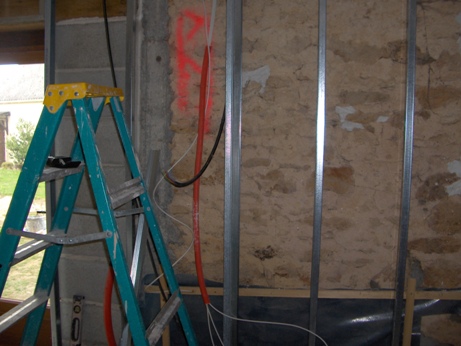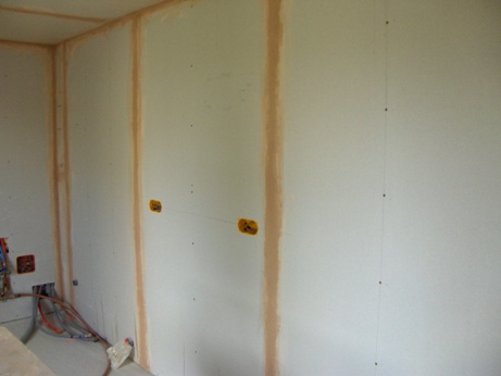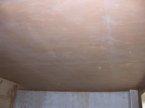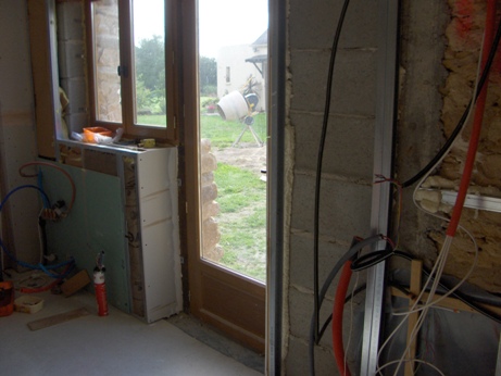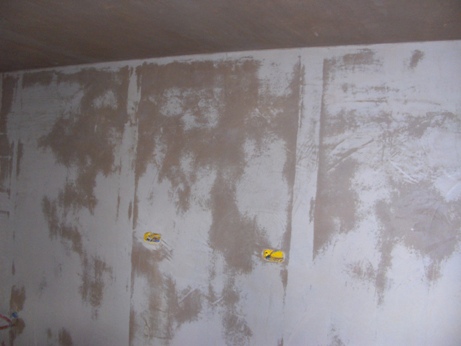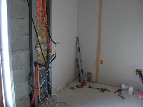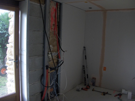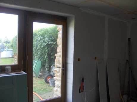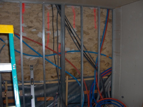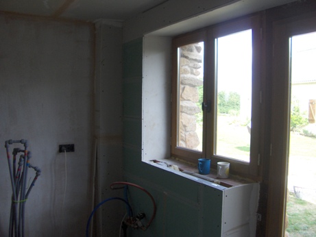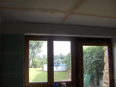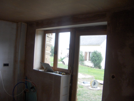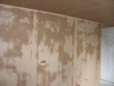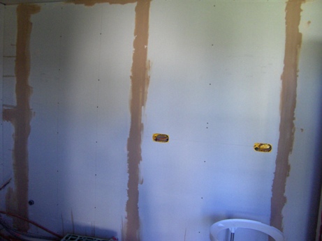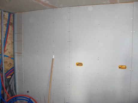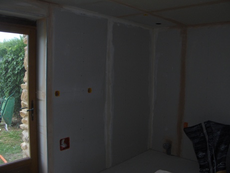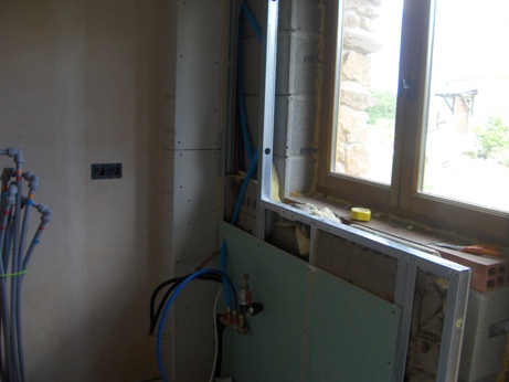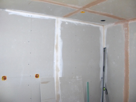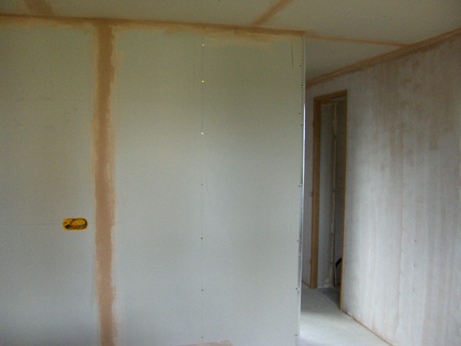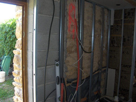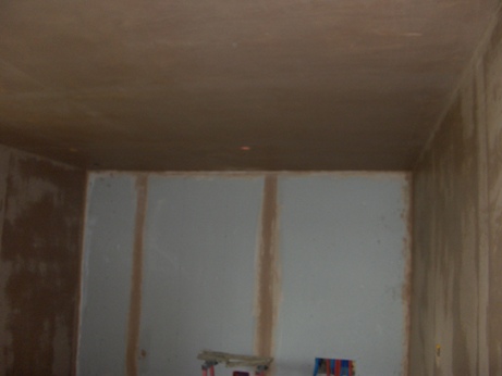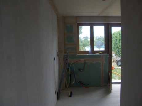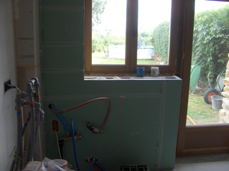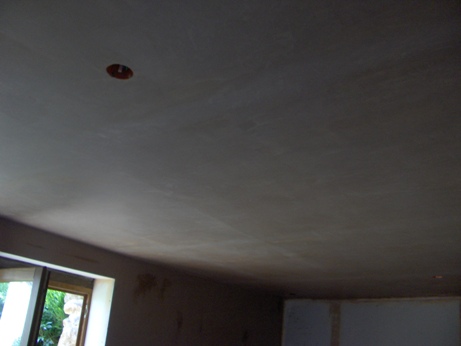 Once all wired plumbed and boarded, the walls and ceiling were plastered before the toilet walls were constructed.