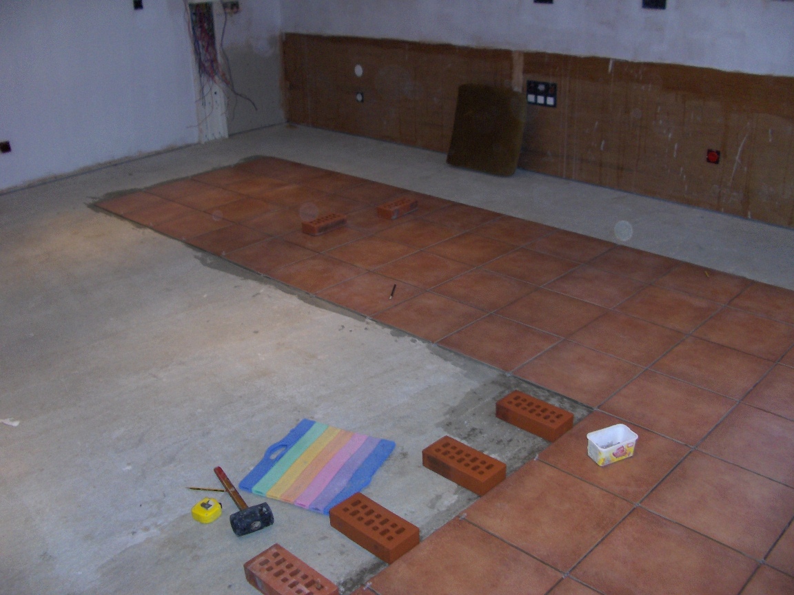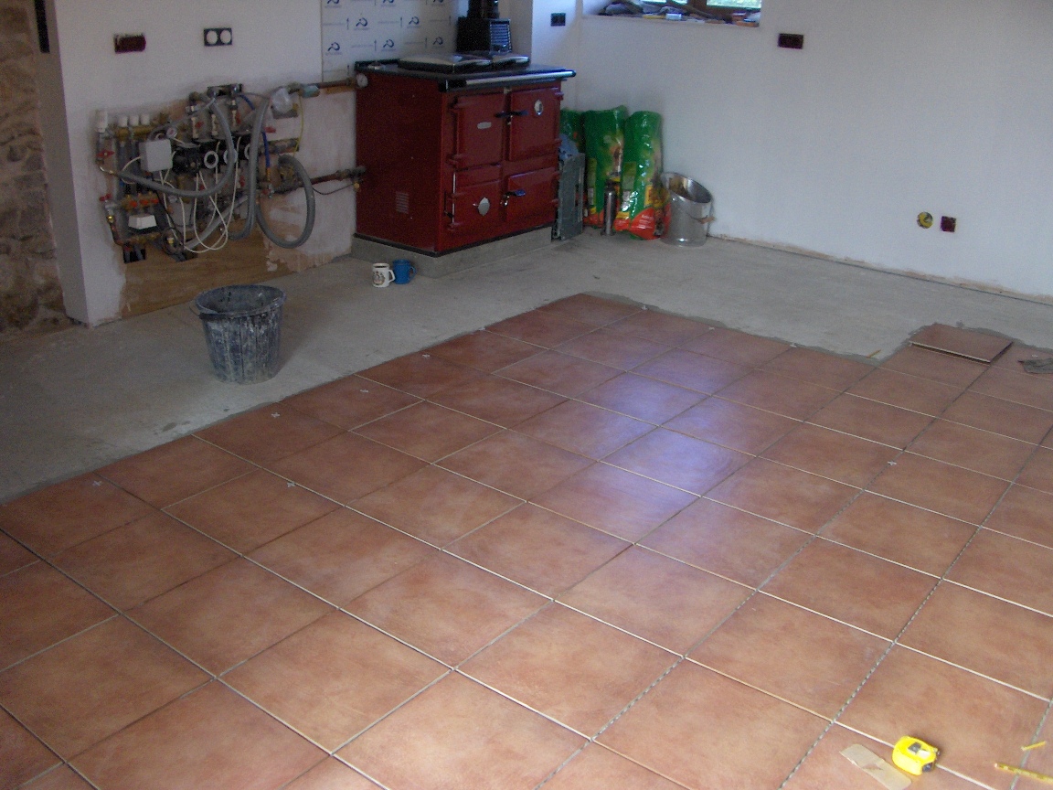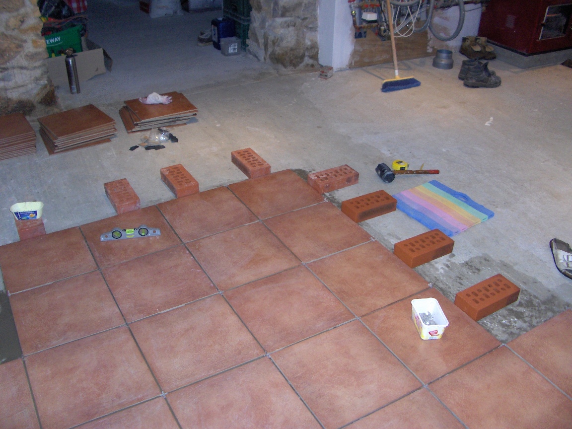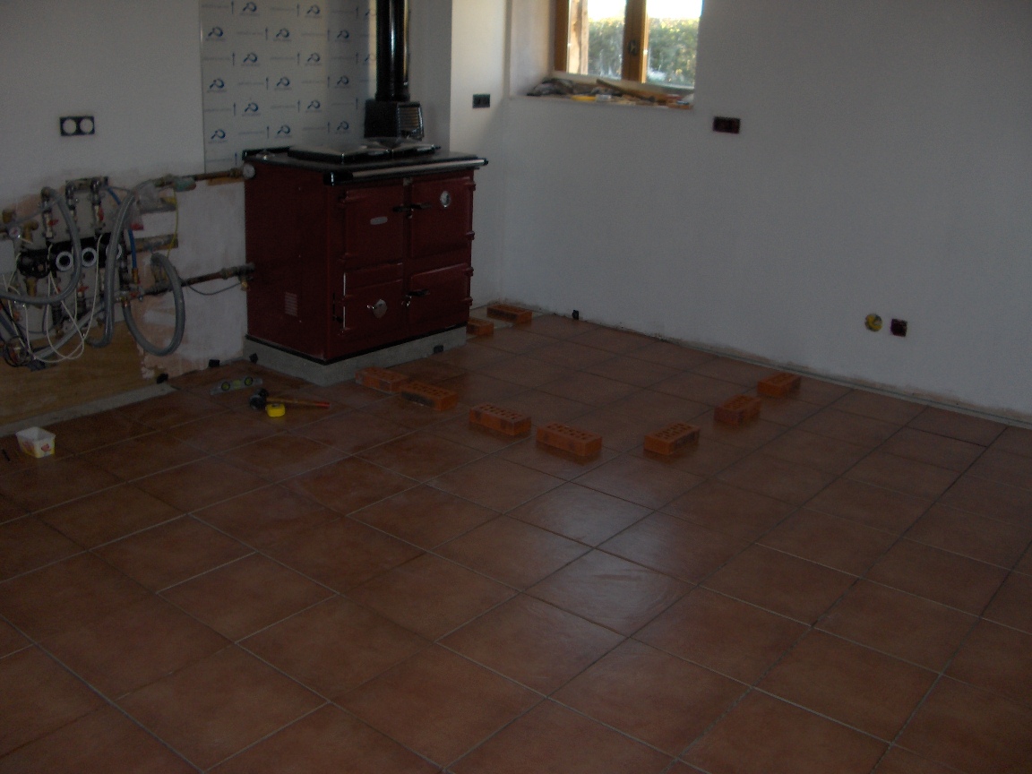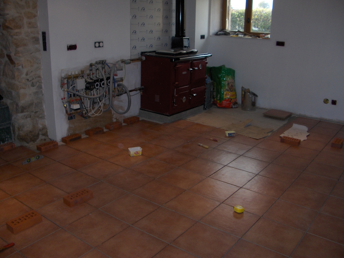 We did have a few sunny days so took the opportunity to mix up some lime mortar and lay stones in the last opening to be closed. Then yet more tiling, the concrete floor was first sealed using PVA then a straight edge was set out as a guide for the first row of tiles. We used some spare bricks from the fire place and chimney to support the tiles whilst the glue went off. We have used a 2mm thick sheet of stainless steel for a splash back behind the Rayburn. |