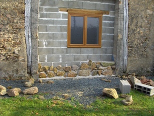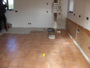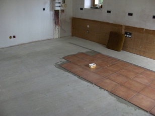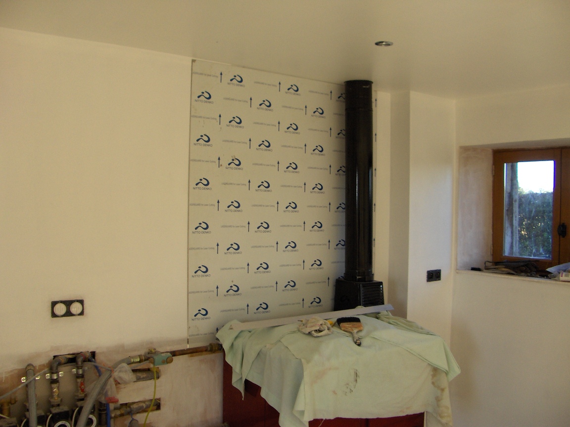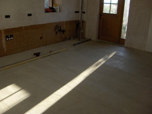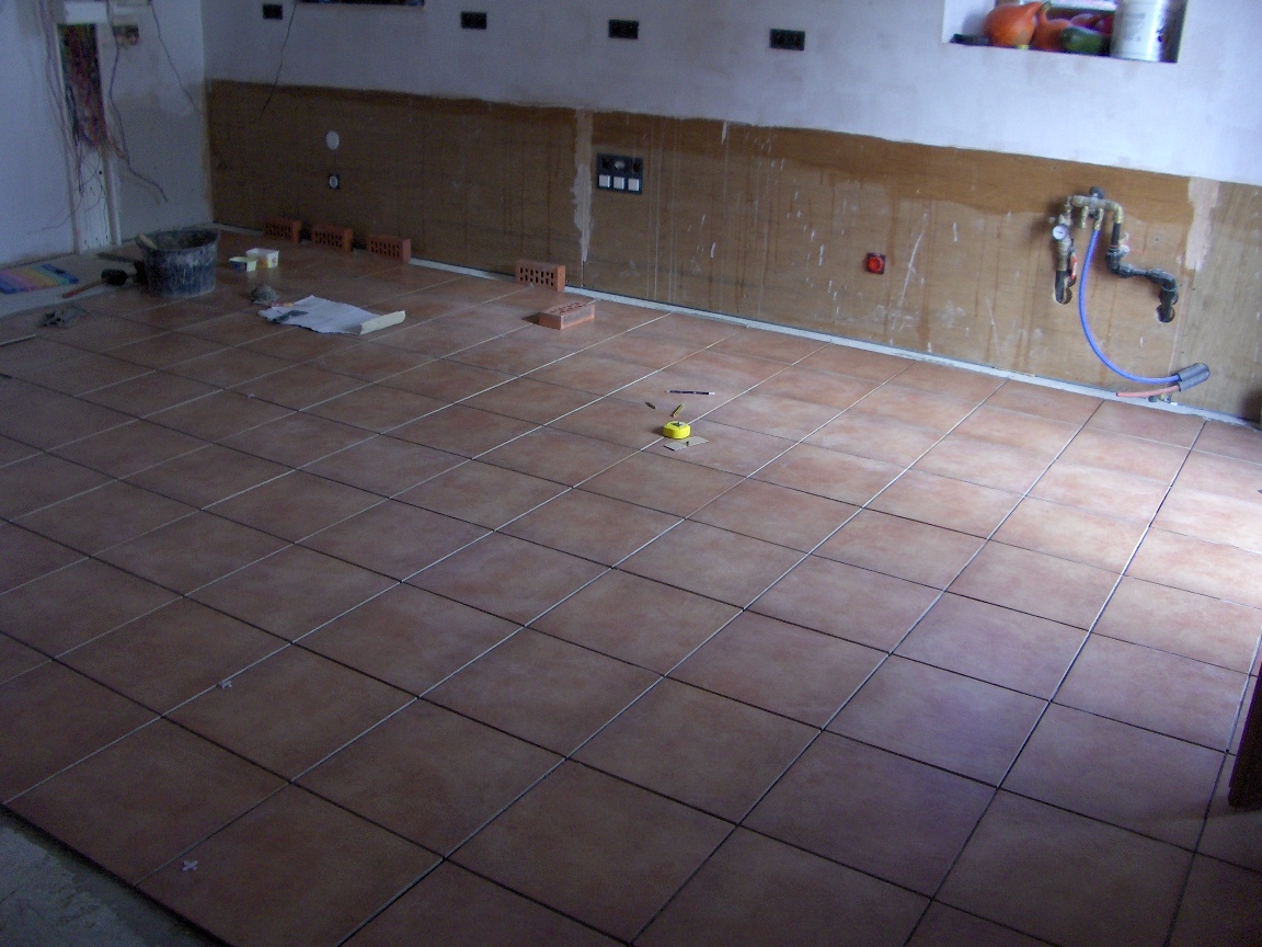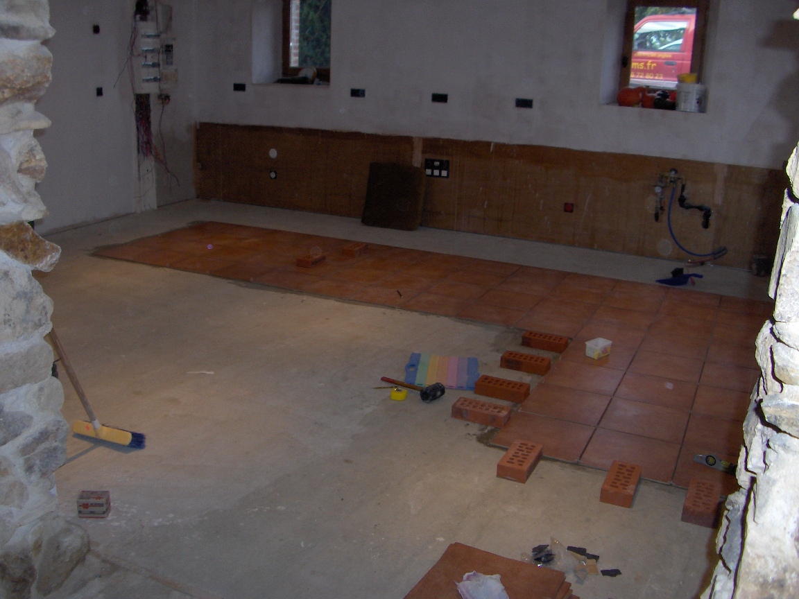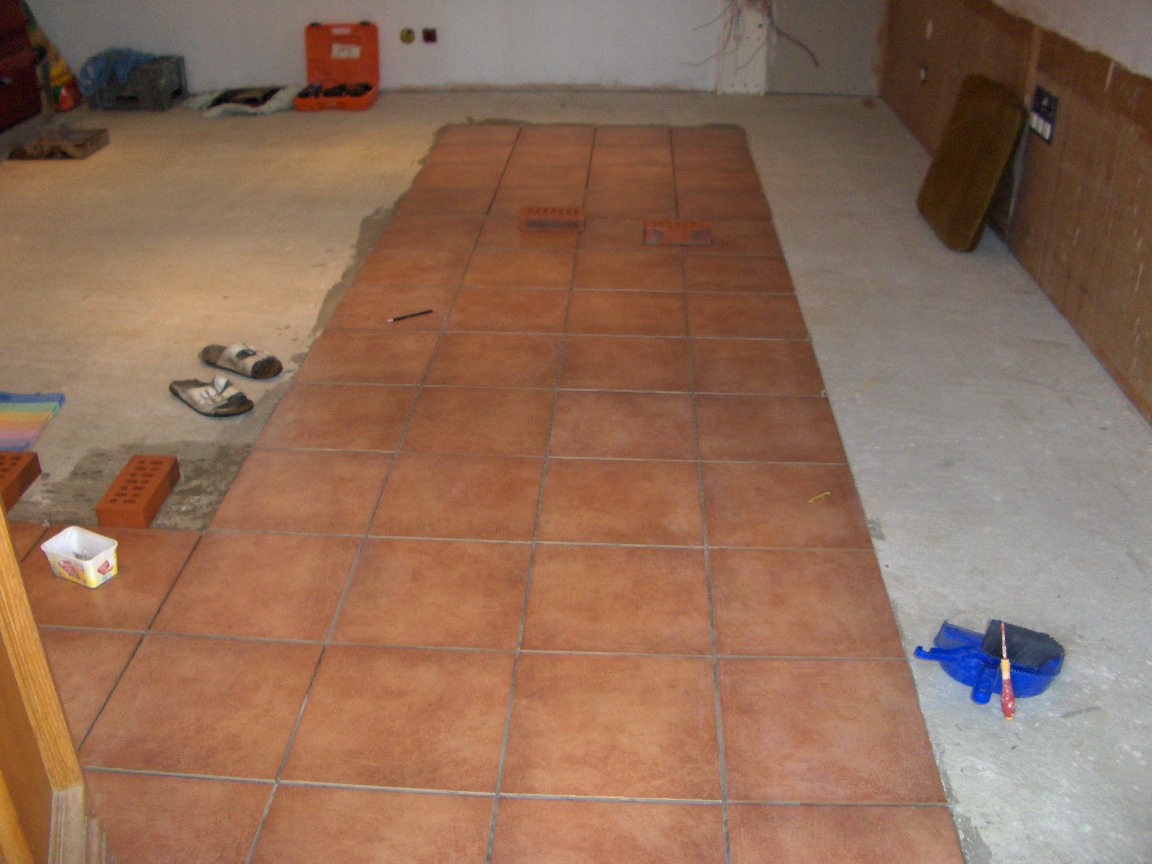 We did have a few sunny days so took the opportunity to mix up some lime mortar and lay stones in the last opening to be closed. Then yet more tiling, the concrete floor was first sealed using PVA then a straight edge was set out as a guide for the first row of tiles. We used some spare bricks from the fire place and chimney to support the tiles whilst the glue went off. We have used a 2mm thick sheet of stainless steel for a splash back behind the Rayburn. |