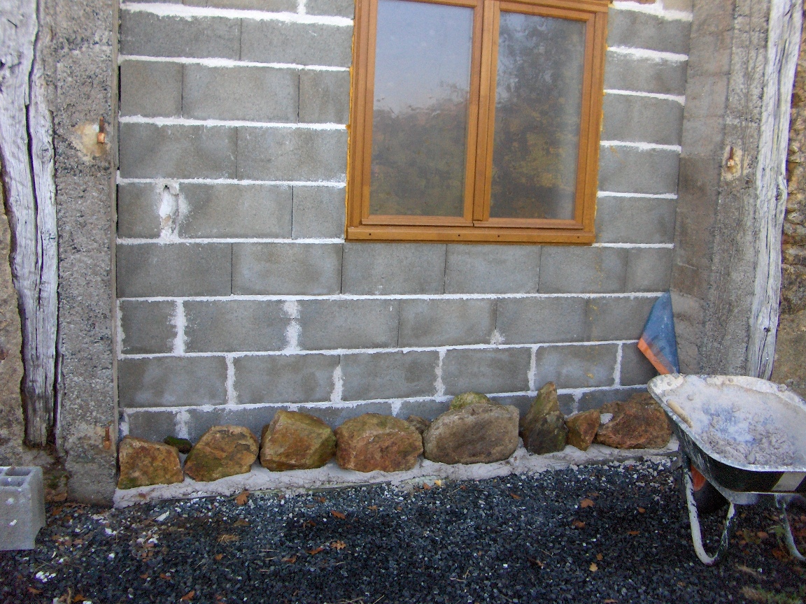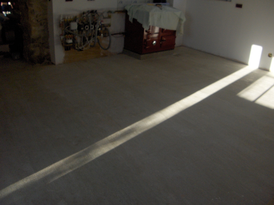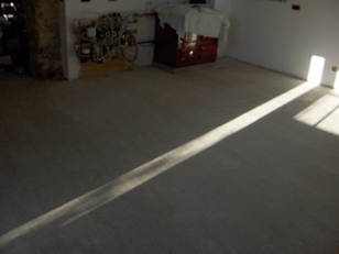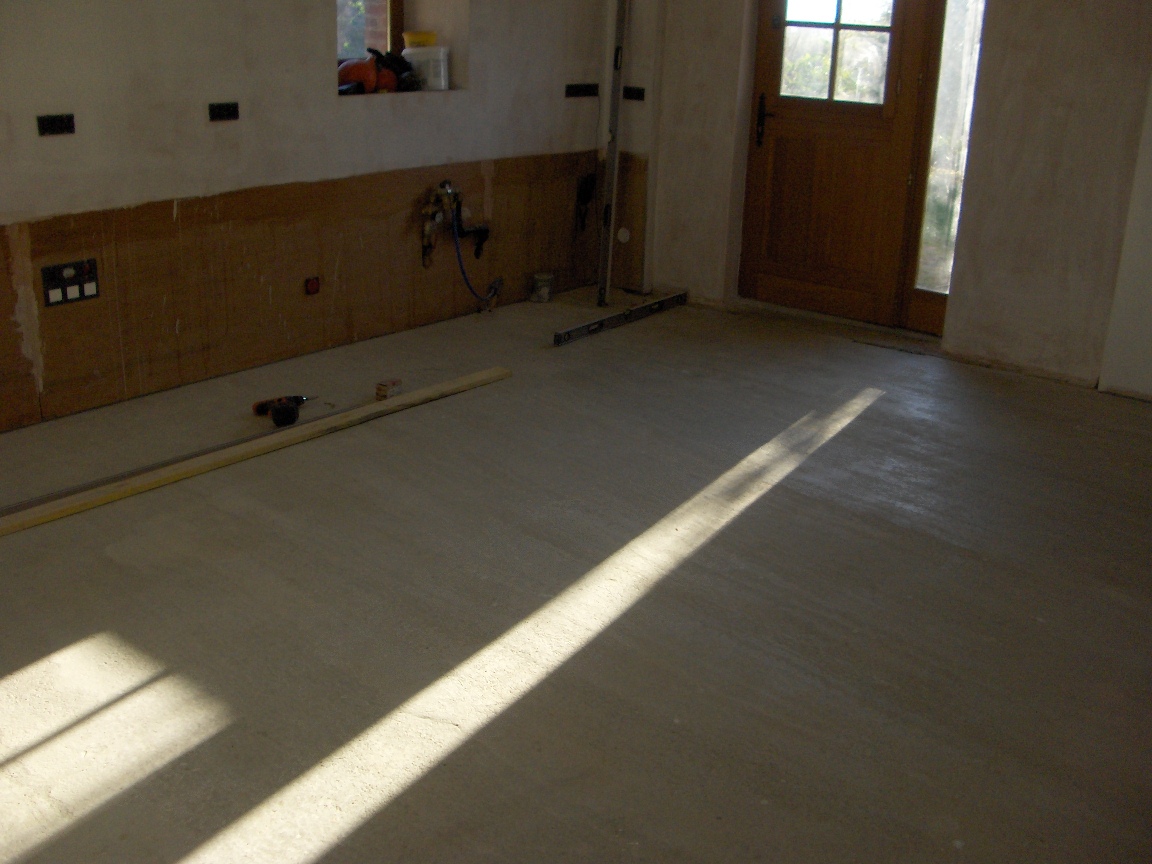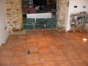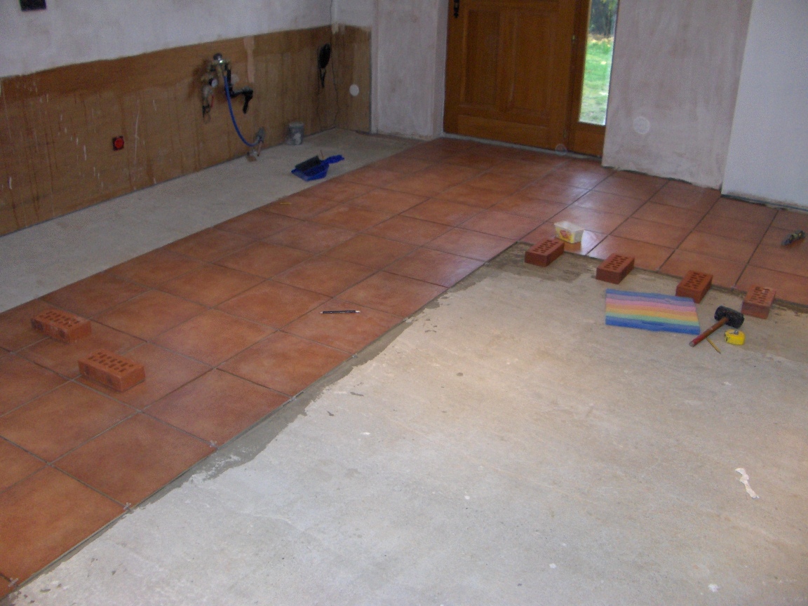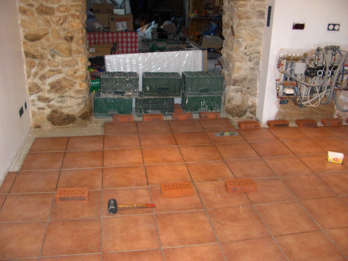 We did have a few sunny days so took the opportunity to mix up some lime mortar and lay stones in the last opening to be closed. Then yet more tiling, the concrete floor was first sealed using PVA then a straight edge was set out as a guide for the first row of tiles. We used some spare bricks from the fire place and chimney to support the tiles whilst the glue went off. We have used a 2mm thick sheet of stainless steel for a splash back behind the Rayburn. |