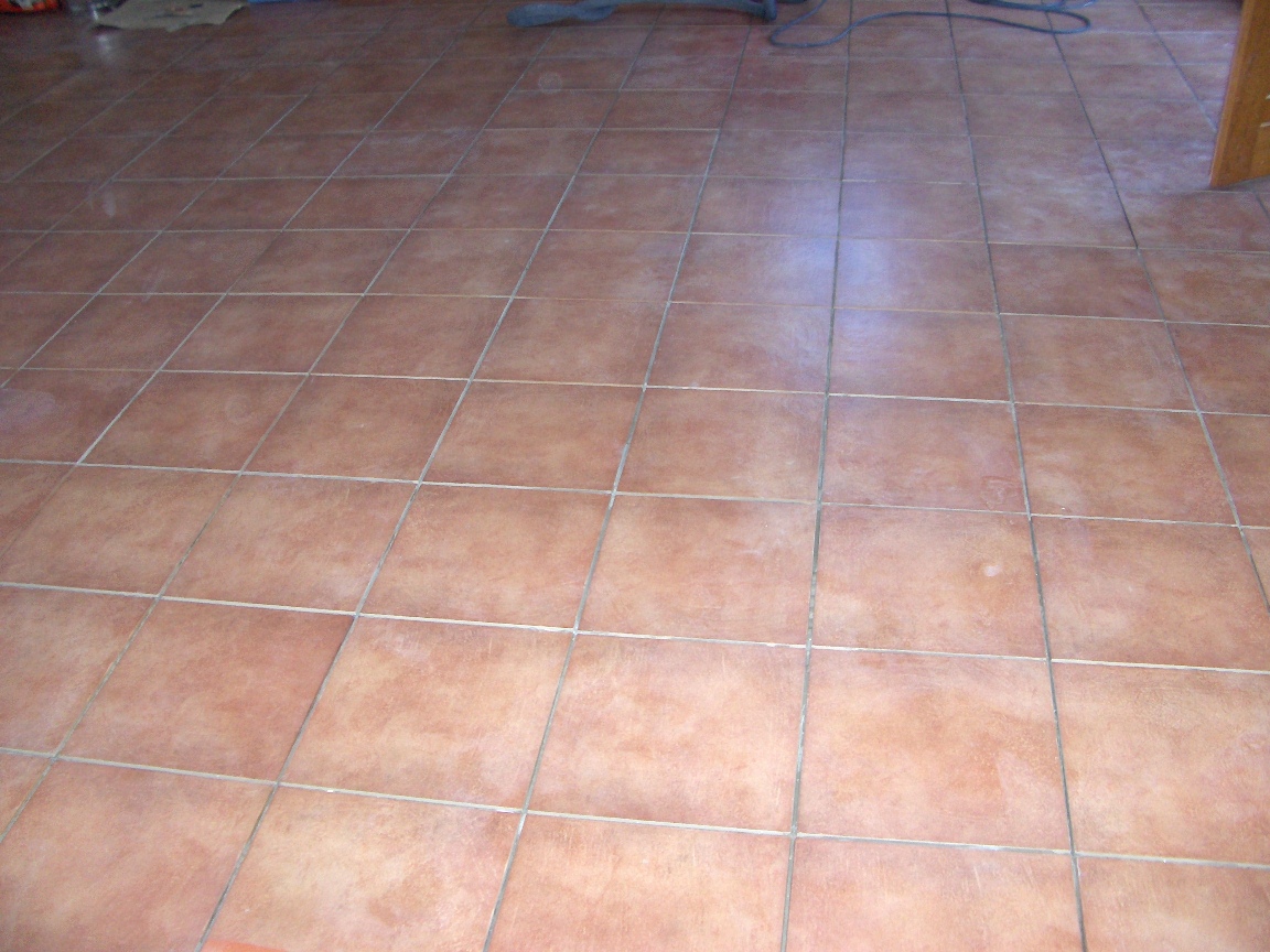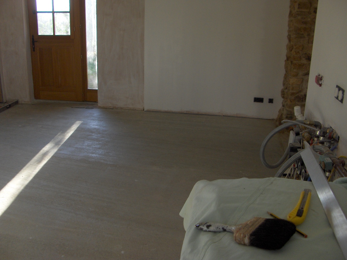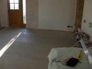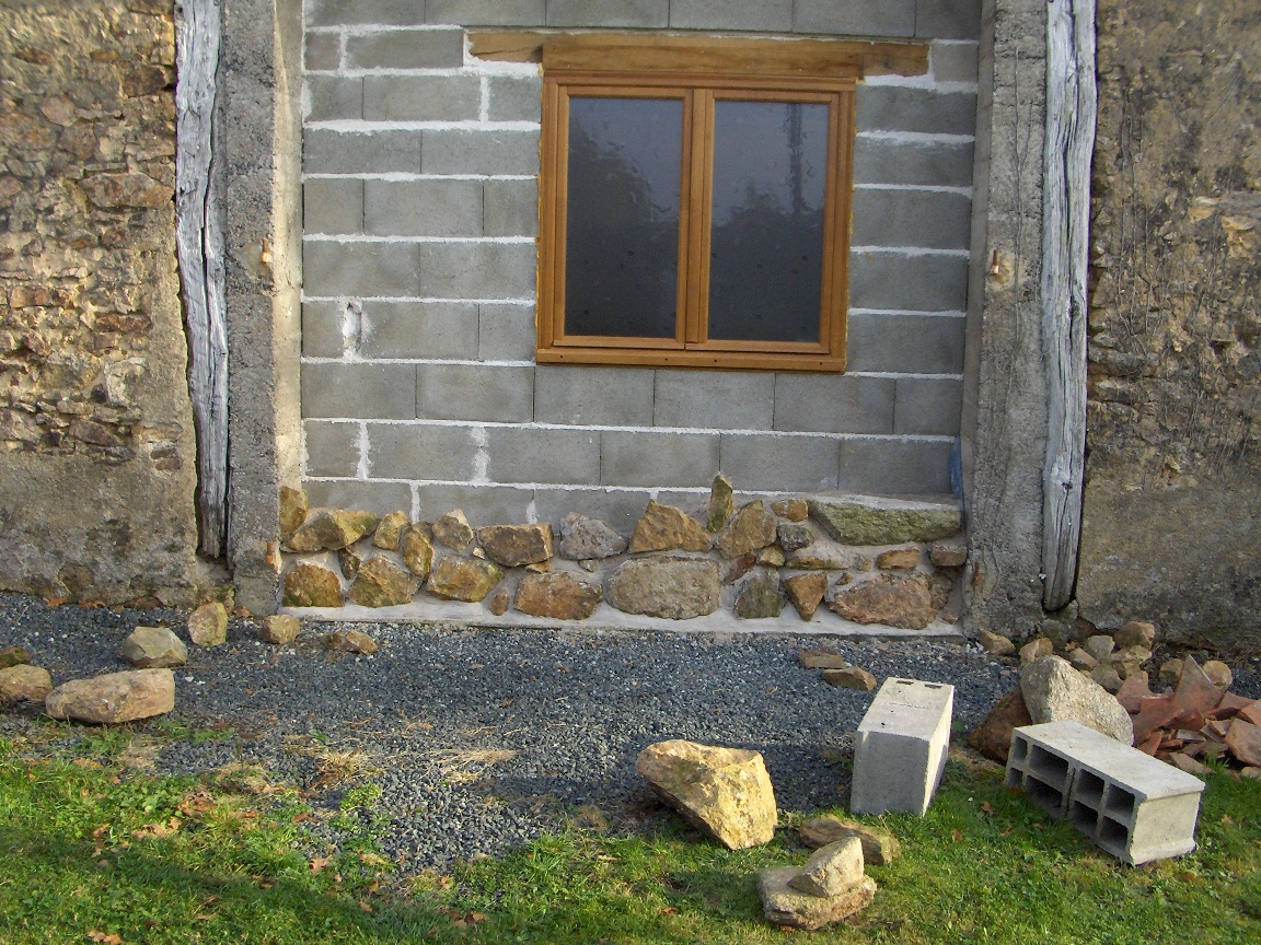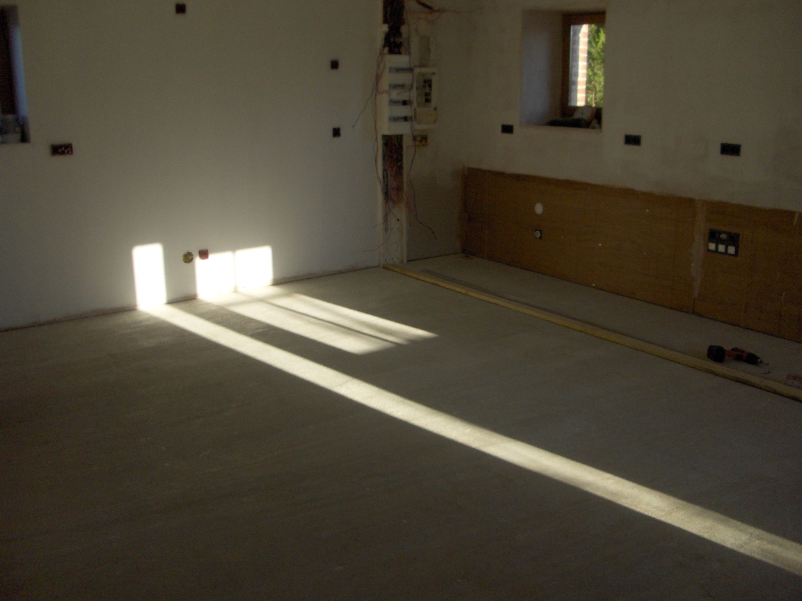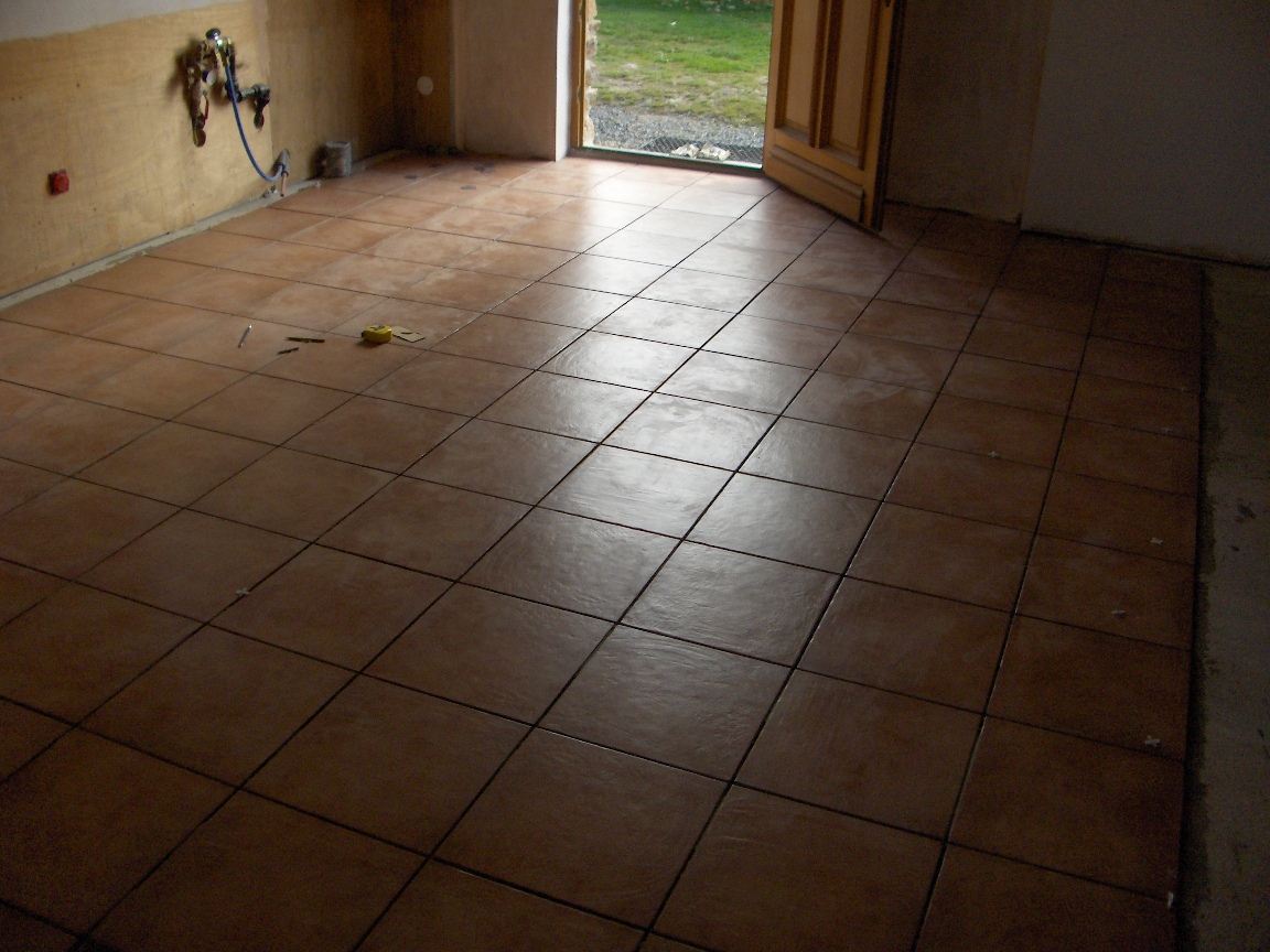 We did have a few sunny days so took the opportunity to mix up some lime mortar and lay stones in the last opening to be closed. Then yet more tiling, the concrete floor was first sealed using PVA then a straight edge was set out as a guide for the first row of tiles. We used some spare bricks from the fire place and chimney to support the tiles whilst the glue went off. We have used a 2mm thick sheet of stainless steel for a splash back behind the Rayburn. |